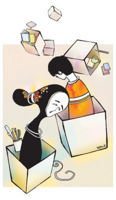 上班两个多月后,M第一次运货到地下层。从电梯出来,就是一片辽阔的空间。没有任何橱柜或间隔,只有一件件不同形状大小的纸箱堆叠在不同区域。电梯门外有一条被纸箱隔出的小走廊,连接空间中央的一张小桌子。小桌上摆放了一些个人用品,和一本看起来像分类记录的账本。M把箱子推到桌子旁,望了望四周,然后看到了正在不远处整理堆积物的大婶。