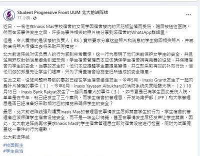 该贴文促请学生宿舍管理层立即对宿舍设施进行检查,同时为试图掩盖这一事件的行为道歉。
