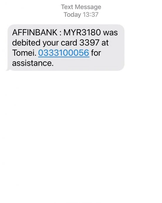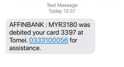 目前刚生下第二胎,正在坐月子的Melody FM DJ关萃汶突然收到了自称来自艾芬银行(Affin Bank)的短讯,指她在多美(Tomei)金钻珠宝有限公司消费3180令吉。