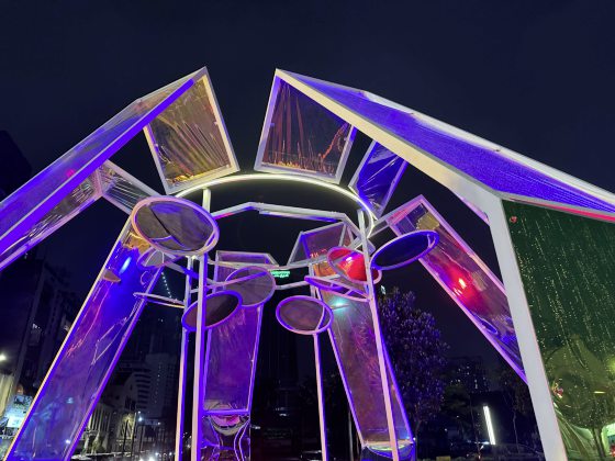 走出中央艺术坊的捷运站,夜晚本无光的绿草地上,多了缤纷色彩。由6个支架撑起的装置艺术,红、黄光线直射亚克力板,发散的光相互倒映。