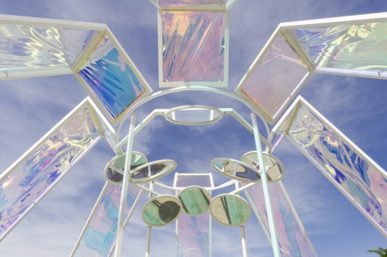 不仅如此,彩虹膜(Iridescent Film )和有机玻璃(plexiglass,亚克力的种类之一)亦是她创作的“好伙伴”,协助她将脑海中平面的想像立体化。单看文字极其抽象,日前在中央艺术坊的捷运站出口旁,放置名为“Oculus”的装置艺术,便是Bono的最新作品。