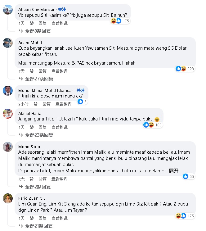 (八打灵再也10日讯)伊党甲抛峇底国会议员西蒂玛丝杜拉前天在脸书发文指我国伊斯兰法机构正处于危险中,但网民针对她日前点名行动党元老林吉祥与新加坡前总理李光耀和前马共总书记陈平是亲戚的言论,在帖文下留言撻伐她。