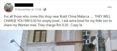 (马六甲12日讯)顾客要求空碗以便能和孩子共享一碗云吞面,却因此被征收30仙附加费,令他大呼不合理!
