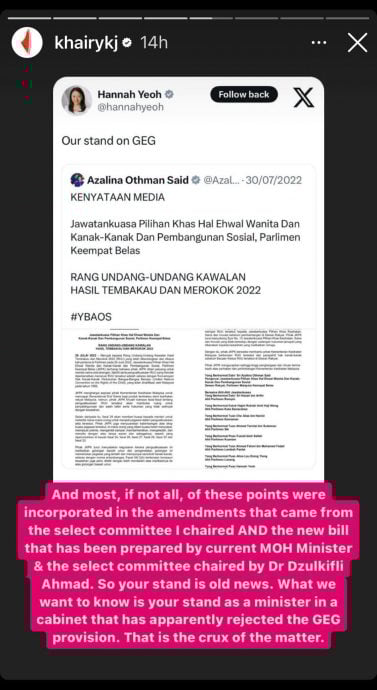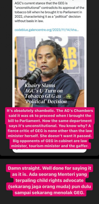 他在数则Instagram限时动态针对禁烟世代法案在被推迟以后可能无疾而终的课题,作出批评。