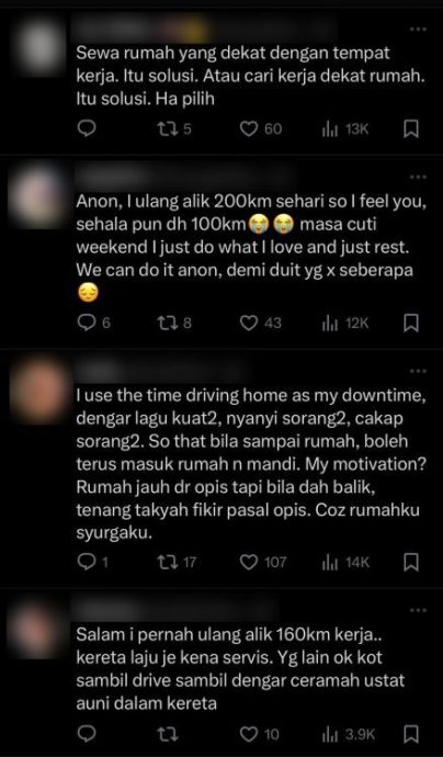 一名网友在社媒X上发文倾诉,表示自己每天都要长途跋涉地往返于住家和工作地点,往返距离高达120公里,还要忍受塞车的痛苦,让网民感到惊讶。