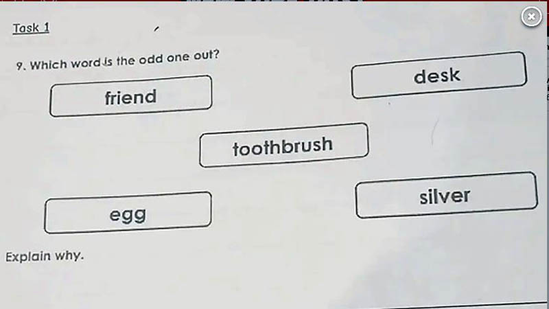 这张功课上列了5个单字,分别是“朋友”、“鸡蛋”、“牙刷”、“桌子”还有“银”。题目要小朋友圈出不同的那个单字,并且在下方解释为什么,但是女网民就是写不出来。