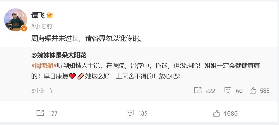 中国知名监制谭飞12日凌晨在微博发文,写道:“周海媚并未过世,请各界勿以讹传讹。”而《红星新闻》访问到周海媚另一名友人,对方表示:“假消息吧?”有知名博主透露,周海媚在北京家中发生意外,工作人员及时发现,被紧急送到急诊救治,经过数小时的抢救,目前已经脱离了生命危险,但仍处于昏迷当中。香港TVB电视台前记者也表示:“在医院,治疗中,昏迷。”