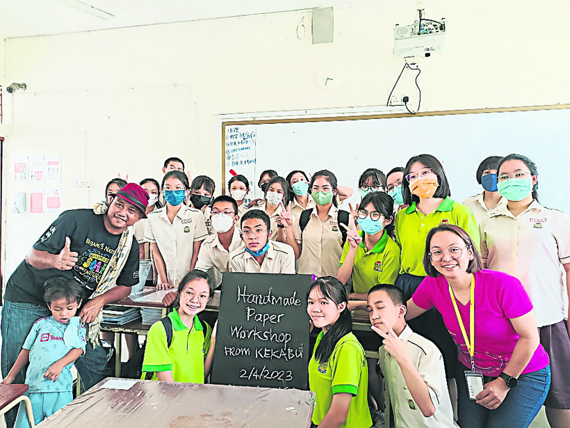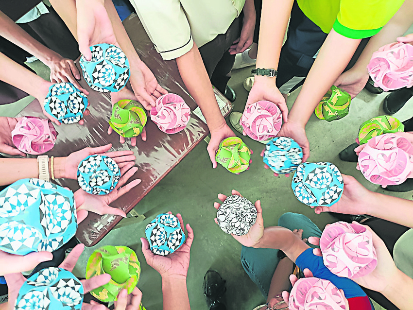 雪婷与一班新民独中的中学生在剪纸课后留影。