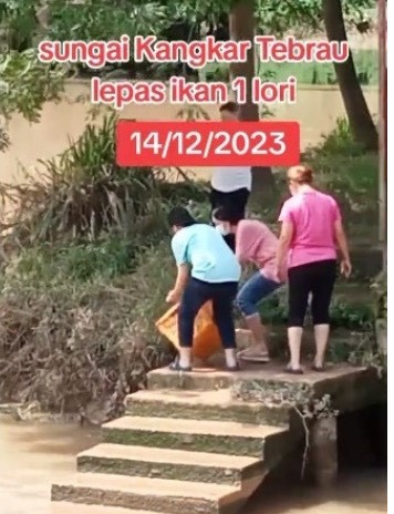 社交媒体日前流传一段视频,数名善心人士扛着一箩箩的河鱼,到新山陈厝港地不佬河放生、做功德。