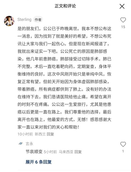 到马六甲骑行旅遊发生意外跌倒及中风的中国男子刘建设昨晚因肺部感染不幸去世,他的媳妇于小红书发文,通知关心事件进展的网友们。