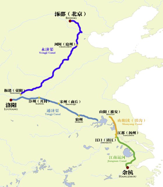 在中国古代,粮食的供应是决定一座都城甚至一个国家兴亡的关键因素,而当时粮食的长途运输主要是靠水运。因此,隋炀帝先后命人开凿通济渠、永济渠和江南运河,连接广通渠和邗沟,成功打造出一条以洛阳为中心的大运河,北接北京,南通杭州,西至西安。南北物资都需通过洛阳转运,洛阳城的重要性迅速提高。