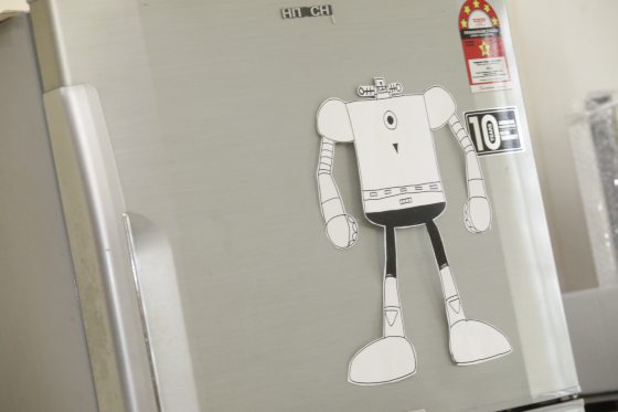 房子非常整洁,整洁得显得有点空旷,最显眼的装饰是贴在冰箱上,由唐家纬亲手画的机器人卡通。