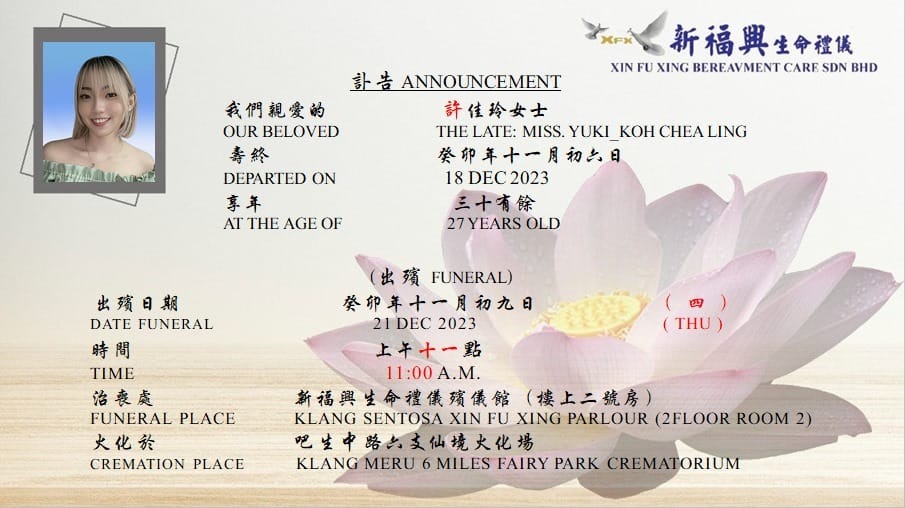 根据许佳玲的弟弟许伟祥在脸书上载的讣告,死者遗体将停柩灵堂供亲友瞻仰遗容。