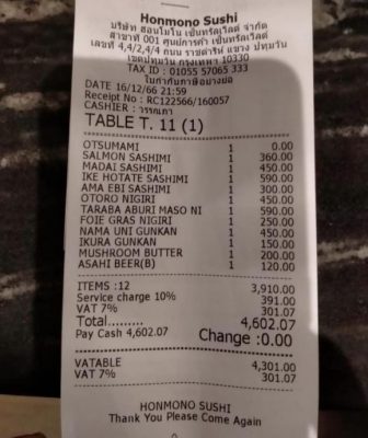 泰国世界日报报道,日本料理店Honmono Sushi老板在脸书分享照片,控诉一名中国籍男子逃单,点了合计4600铢的食物和饮料,吃饱后借口上洗手间便人间蒸发。