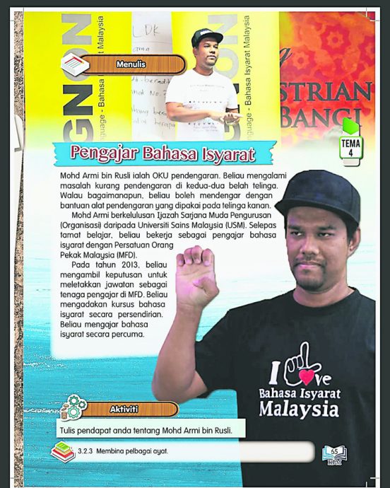 以手语翻译员作为志业的莫哈末艾尔米·罗斯里(Mohd. Armi Rusli)是一名听障人。大学毕业后,他在雪兰莪蒲种的聋人联合会(MFD)工作,就职期间,艾尔米学习了手语,同时更深入瞭解聋人群体文化。