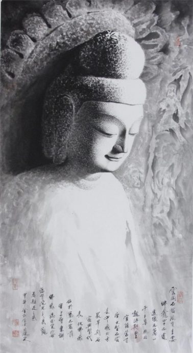 “几代人才完成一个石窟,石窟艺术是伟大的,在他们面前我是渺小的。”他叹道。这些无名艺术家深深激励着他,作画时,那叮当叮当的敲击声老是在他的脑海里回荡。他说道:“我觉得我画画也要学习古代工匠的精神,把佛像一点一点用墨叠出来,有的地方用焦墨,有的地方用水墨,叠的过程,就好像在雕刻一样。”