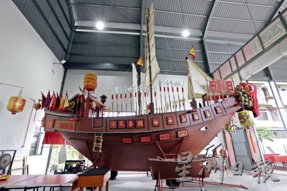 12月中旬,来到位于马六甲怡力(Bandar Hilir)的勇全殿,尚未抵达目的地以前,路口处早已竖起本届主题“呷康泰安民纳福七朝王醮送王舡庆典”。穿过主殿到后堂,便来到隐身于勇全殿内的造舡厂。