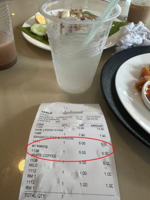 社交媒体近日流传一张在珍南海滩一间餐馆的收据照片,显示一杯白开水售价5令吉,令消费者大感吃不消。