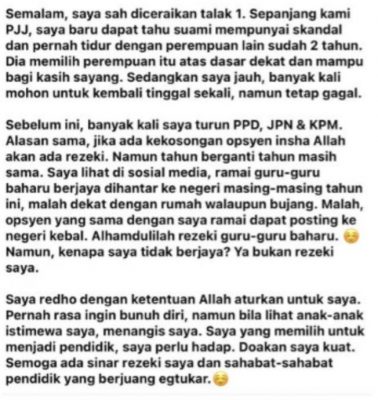 据“World of Buzz”报道,一名拥有12年教学经验的女教师因为工作关系,被迫过着与丈夫分隔两地的生活,即便多年来她一直向教育部申请调职,然而却不被批准,最后丈夫另结新欢,还向她提出离婚,让她感到晴天霹雳。