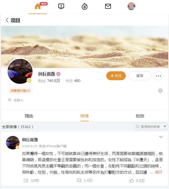 闾丘露薇近800万粉丝的微博账号是在2019年反修例运动期间被封的。可是早在那之前,每年六四纪念前后她的微博账号都会被封,先是1天,然后7天、1个月、3个月。她自认自我审查,只是写“维园的月色好美”“好多人”也被封。