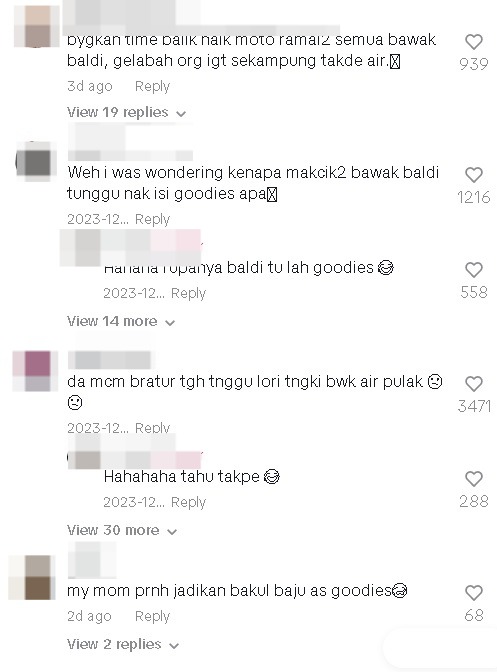 “想象一下一群人骑着摩托载着水桶,一定有人好奇哪个村落没水来”、“我还以为是哪里的花园发生制水了,大家纷纷取了水桶排队拿水”、“我以为这些妈妈们带着水桶排队领取什么纪念品”。