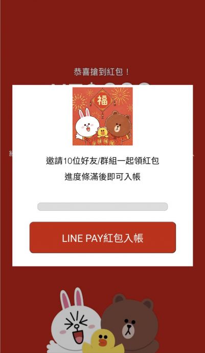 在领取红包后将显示用户抢到的红包金额,并表示“红包金额是否入账将会依据您的完成步骤而转入”。若用户随后按下“将红包转入钱包”的按钮,则会要求用户“邀请10位好友/群组一起领红包”,并声称要完成这步骤红包才能入账。