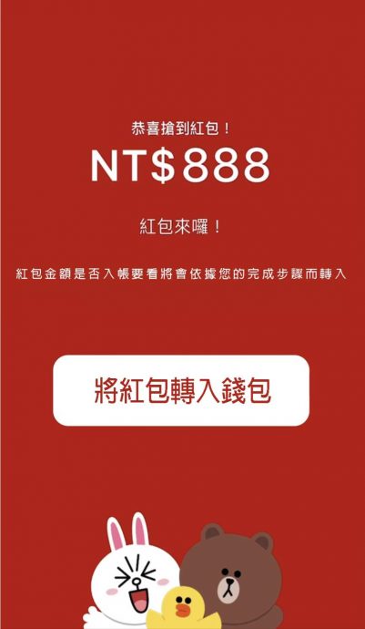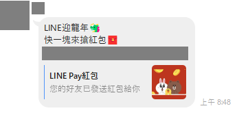 自1月1日起,网络上流传一则夹带着不明链接的讯息,并以“LINE迎龙年 快一块来抢红包”的标题吸引民众点击该链接。在点击进入该链接将出现一个写着“领取红包”的红包装饰按钮。