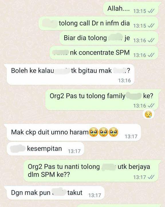 “阿菲克弟弟多次拒绝我的帮助,因为他害怕母亲知道后会生气,因为他母亲是某标榜宗教的政党的坚定支持者,认为巫统的钱是违反教义(Haram)的。