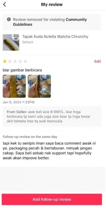 (吉隆坡12日讯)女子网络上购买一款自称爆红的马蹄蛋糕(kek tapak kuda),岂料收到成品后发现货不对办,蛋糕太薄、味道难吃,而且包装破裂;女子在网上留下差评后竟获得卖家粗鲁回应,让她非常失望。