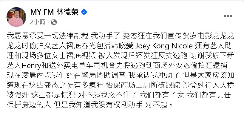 (吉隆坡20日讯)林德荣动手打人,深夜在警局报案!昨(19日)晚贺岁电影《龙龙龙龙龙》在吉隆坡某商场宣传,现场有一名华裔男子混在人群中,竟大胆偷拍女艺人、助理等多位女子裙底春光,林德荣得知后大动肝火,联同另外两名男子一起合力追捕变态偷拍狂,逮到后更忍不住出手殴打教训对方,林德荣在脸书上传该男子无打马赛克影片,直言:“我动手了,我愿意承受一切法律制裁!”