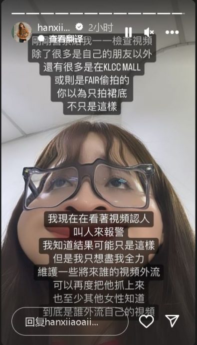 事实上,遭偷拍的韩晓嗳比林德荣更早在社群网揭发这起事件,她昨晚约10时许在IG限动连发数个短视频,包括质问偷拍狂“你已经第几次了?”并揭发该男子原来是一名惯犯,每次干案都会将手机放在paper bag(纸袋)内,经过女性旁边时就会伺机由下往上偷拍裙底风光。韩晓嗳也PO出一张该男子手机里满满都是偷拍女生裙底的视频截图,她在警局也协助找出受害者并叫她们来报警,不希望将来若有不雅视频流露出去也不知发生甚么事。