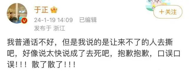 对此,于正晚上开直播拗说:“我普通话不好,但是我说的是让来不了的人去‘撕’吧,好像说太快说成了去‘死’吧,抱歉抱歉,口误口误”,但网民却不相信,批他小心眼。对此,他回应,“有人说我小心眼,我就是小心眼;有人说我长得丑,可我觉得我自己太帅了”,自我感觉很良好。