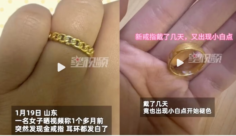 经金店检验确认首饰都是真金后,女子又购买了一对新的金戒指。然而戴了几天后,新戒指竟然也出现了小白点并开始褪色。