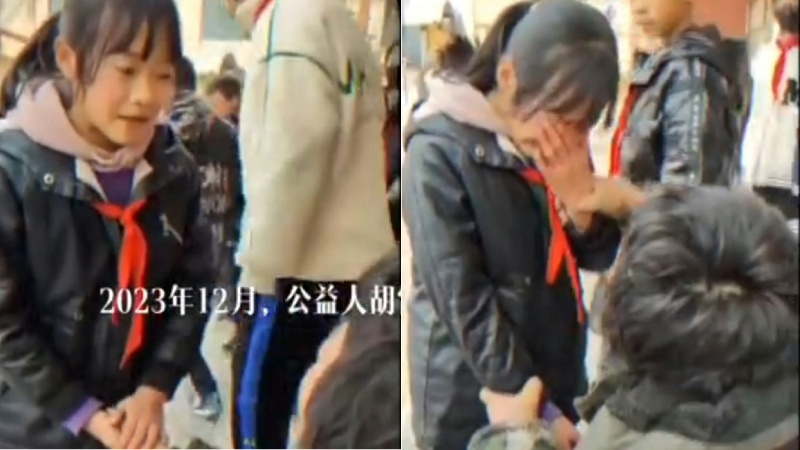 视频中,胡雷跪坐在地上,受赠女孩将一盒牛奶递给他并插上吸管,双手紧握他的手流泪说“希望您永远平安”。胡雷鼓励她好好读书,“叔叔会帮你一把的”。这则视频感动万千网民。