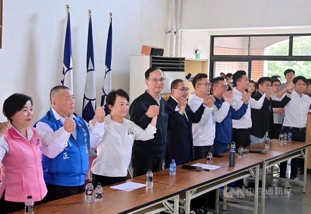 图为国民党台中市党部20日举办感恩茶会,卢秀燕(左三起)、侯友宜及朱立伦等人出席,携手向竞选团队致意。