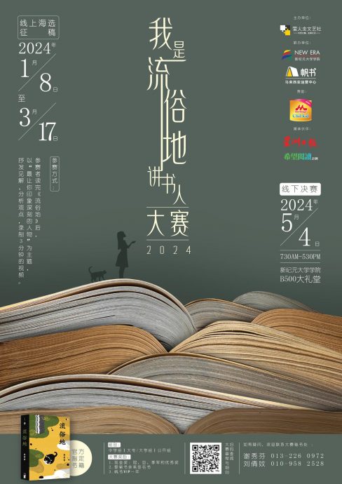 萤火虫文艺社主办,新纪元大学学院和帆书马来西亚运营中心联办的“我是《流俗地》讲书人”大赛,将于5月4日(星期六)早上7时半至下午5时半,在新纪元大学学院举行总决赛。这场大赛也获得Morinaga Chil-kid为赞助单位,星洲日报《活力副刊》为合作媒体。