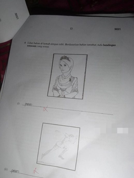 其中第四题的看图说故事,要求考生根据图片写下对比词句,而该考生对一个穿著马来服饰的女子图案写下“Puteri”(公主),一个跑步的图片写到“Pelari”(赛跑者),两个答案都被打叉,没有分数。