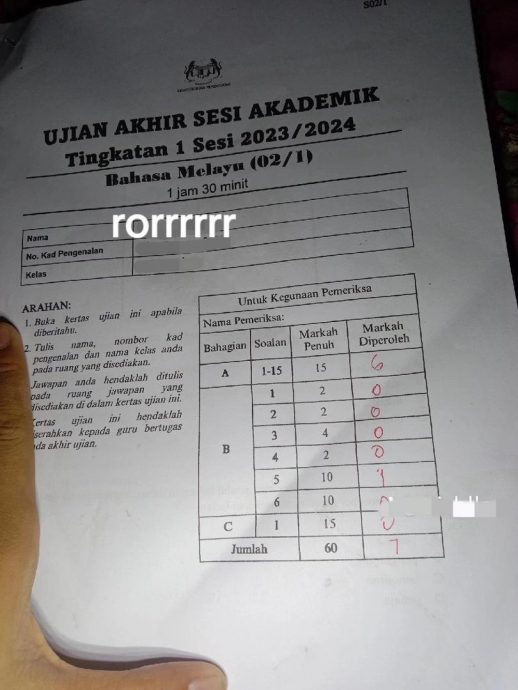 网民在社媒X分享中一马来文考卷,对孩子的学习能力,以及受到网红影响的情况感到担忧。