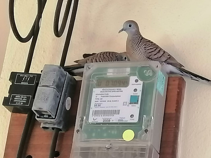 坐在客厅里看电视节目的我又听到阵阵柔和而间断的咕咕声。难道它又来了?这只斑鸠第三次出现了。它曾经两次在我家的电表上筑巢时让纤细的干树枝掉落在大门左侧下。趁它飞走,我把电表上未成巢的干细枝扫落,希望它改往他处筑巢。想不到隔了几天,它重现了。这次它没筑巢,只栖息在电表上咕咕地叫个不停。