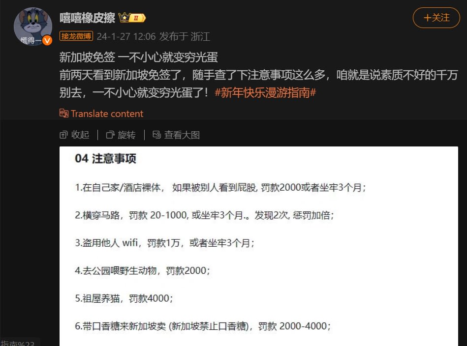 中国微博日前热搜第一的标是“#新加坡免签不一小心就变穷光蛋#”,当中列举了多项新加坡规定,包括任意横超马路可处20至100新币(人民币105至528元)罚款,严重者甚至会被判刑3个月。
