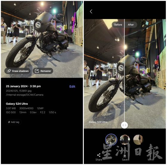 先说基础修饰,打开相簿,挑选一张照片,然后点击底下“i”的图标,AI就会自动跳出修图建议,像是“Background effect”、“Remaster”等,交由AI修图。至于生成式编辑功能,当用户用S Pen删除障碍物、抠图移走路人物件或调整倾斜照片时,AI会自动填补缺失的细节和画面。