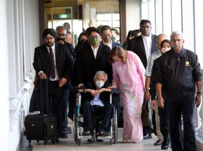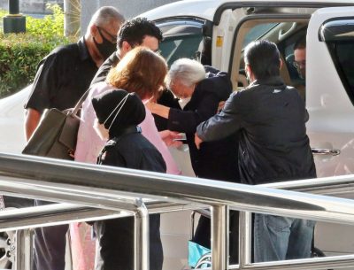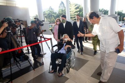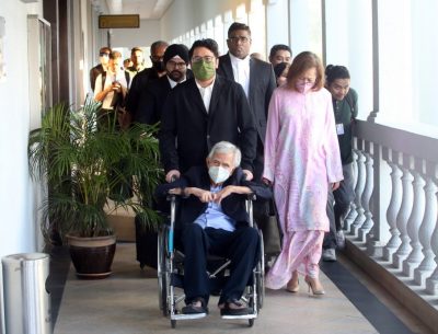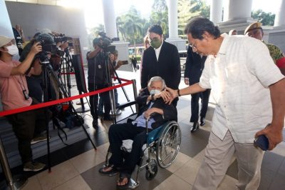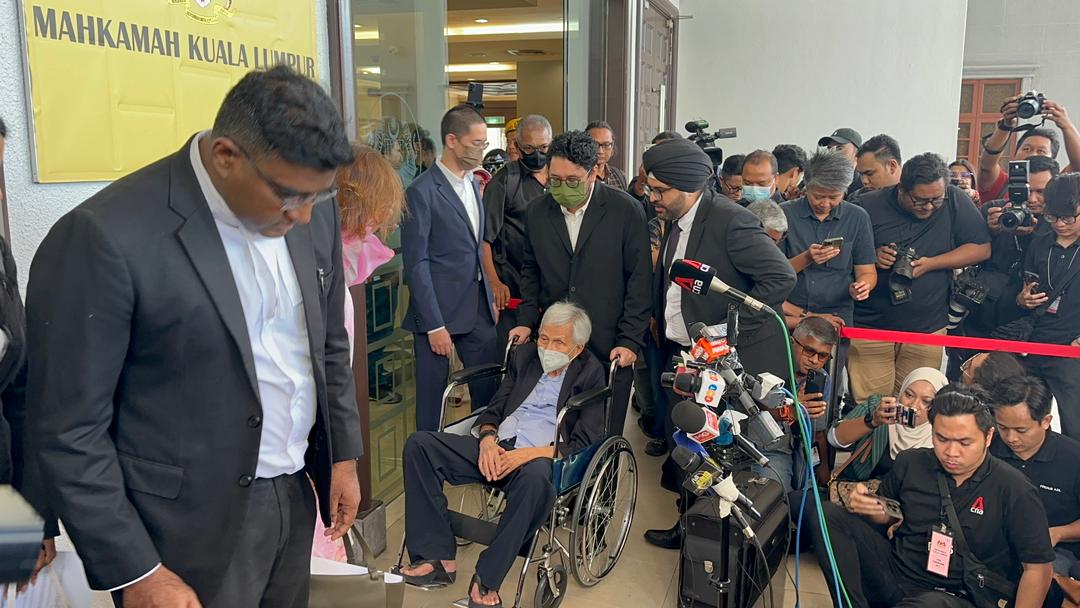 0840am 敦达因抵达吉隆坡法庭,刚出院身体虚弱和行动不便的他坐轮椅进入法庭。他的妻子杜潘纳伊玛陪同。