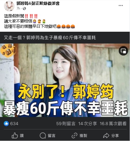 以标题“永别了!郭婷筠暴瘦60斤(约36公斤)传不幸噩耗”的新闻近日在网上疯传,称郭婷筠为生孩子而体重骤降,不幸离世。郭婷筠驳斥强调准确的瘦身数字是34公斤,并指生完第一胎后,经过不断尝试减重方法,包含催吐、针灸等,所幸最终找到正确的方法,靠调整饮食顺利瘦身。