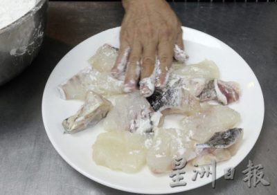 有人说裹粉要加蛋液会更滑?粉的选择也很多。面糊和沾粉可以隔开食材与热油,避免食材水分过度蒸发。一般上有干粉、湿粉、面糊、面包糠数种方法,不同裹粉方式炸出来的口感都有别。在这道料理中,只需把清洗好的鱼块沾一层薄薄的生粉即可。