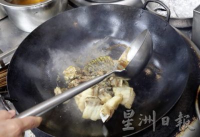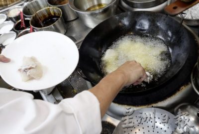 油温控制在大约90度,把裹好粉的鱼放进油锅, 炸到外层呈金黄色,大约六成熟便可捞起。在这个步骤切勿把鱼炸全熟,以防焖煮时鱼肉变得软烂。