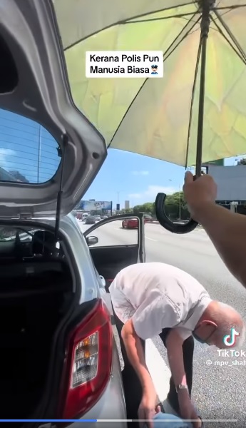 大马皇家警察日前在脸书专页上载一段3分钟38秒的视频,显示一名警察如何协助面对车子爆胎的老翁,除了协助停下车子让老翁能把车子驶到大道的左边,还帮忙放置三角警示牌,并更换轮胎。