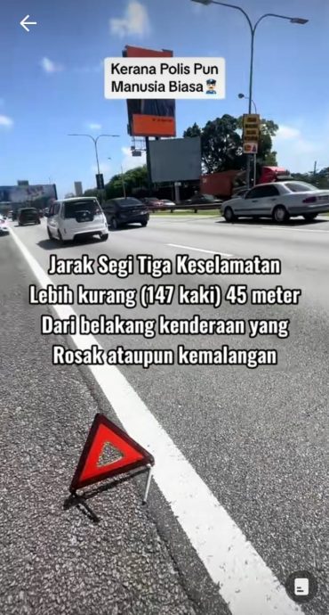 完成车子的移动后,警察也提醒需要在车后放置三角警示牌,提醒其他道路使用者要注意。视频中也讲解道,三角警示牌需要放置在离车子最少45公尺(147)外的位置。