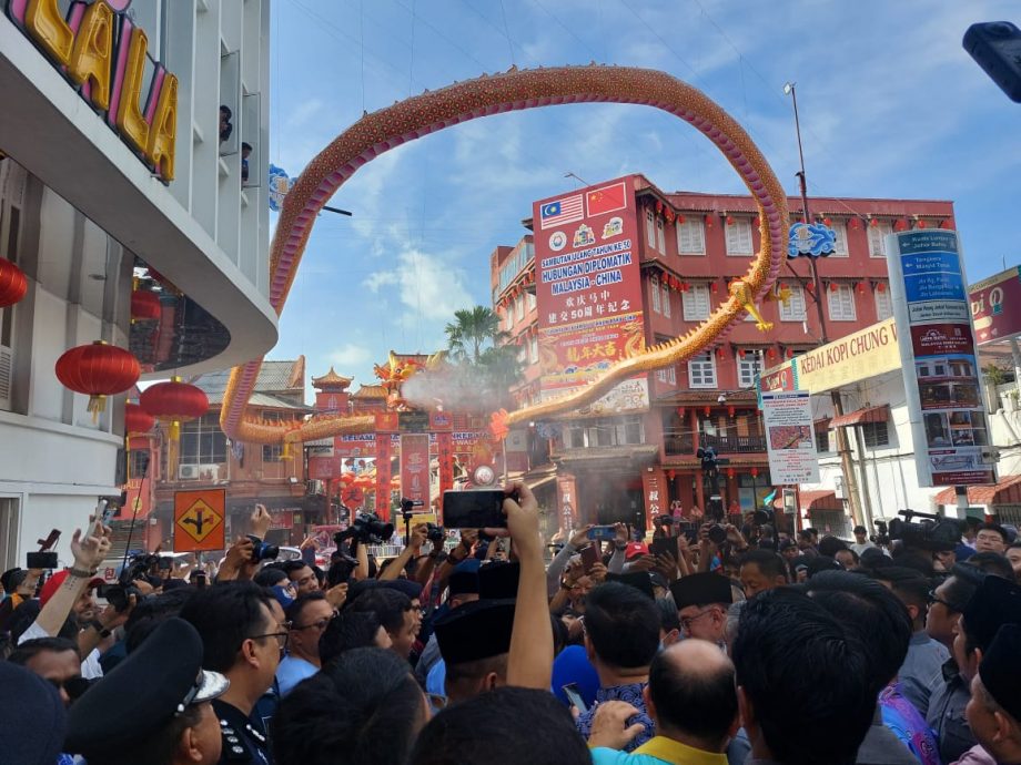 (马六甲9日讯)首相拿督斯里安华趁着年除夕莅临红屋广场一睹全马最长的“马中友谊祥龙”及亲睹鸡场街甲辰龙年的巨型“龘龘龘”飞天祥龙,感受祥龙晒水,所到之处引起民众疯狂。