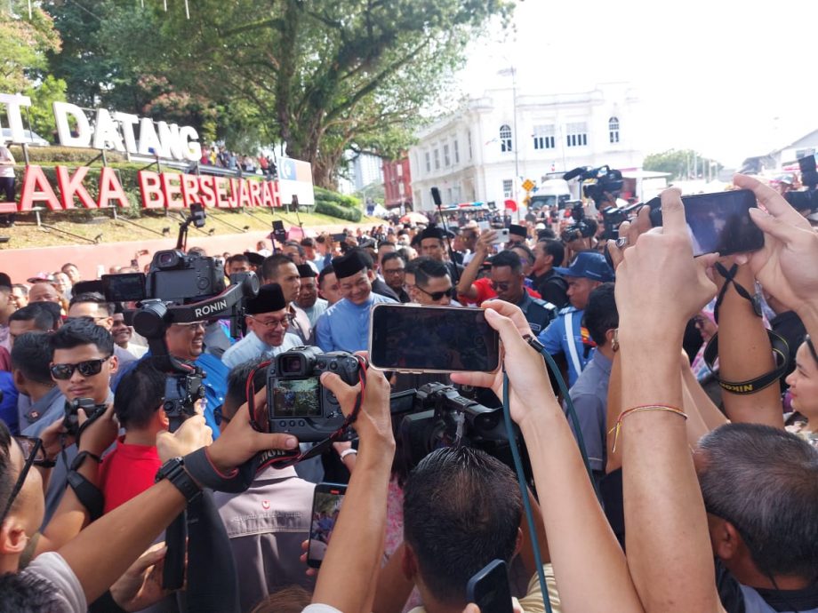 安华先从红屋广场步行,许多公众夹道欢迎,有者也站在高处拍照。安华在甲首长拿督斯里阿都拉勿夫、鸡场街工委会主席拿督威拉颜天禄、甲国州议员、市长等的陪同下进行短距离参观。