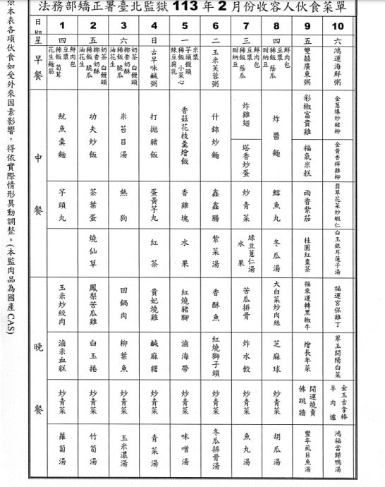 根据台北监狱公布的年夜饭菜单,除夕中午有彩椒富贵鸡、米糕、桂圆红枣茶,除夕夜还有黑椒牛肉、长年菜、佛跳墙、烧卖及虱目鱼汤可享用。